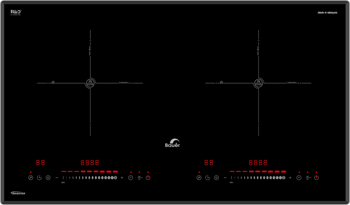 Với hai vùng nấu từ có công suất lên đến 2000W (booster 2400W) mỗi bên, bếp từ Bauer 389SA giúp bạn nấu chín thức ăn một cách nhanh chóng. Chức năng Booster tăng cường công suất, rút ngắn thời gian đun sôi, đặc biệt hữu ích khi bạn cần nấu gấp.